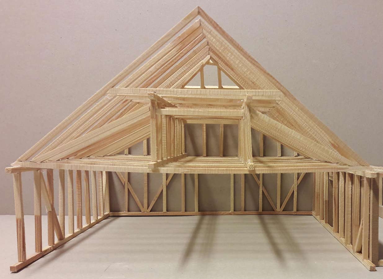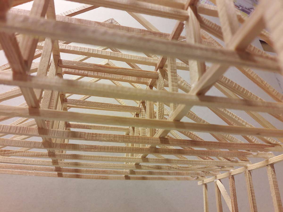 Det er to lag med vannrette hanebjelker under taket: et lag med 15 meter lange hanebjelker som går vegg-til-vegg, og så et lag med kortere hanebjelker lengst oppe. Begge lagene skaper et slags dybdeperspektiv. Imellom disse to lagene er den unike bærekonstruksjonen som kan belyses slik at formen kommer til rette. Lyskorridoren i midten vil komme glimtvis til syne for de som vandrer under bærekonstruksjonen, noe som kan skape en Zoetrope effekt.